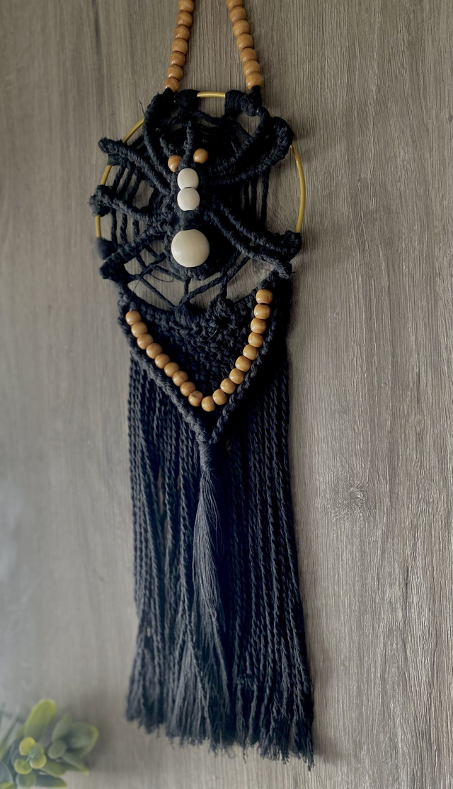Suspension murale en macramé noir, réalisée en forme de toile d’araignée pour une décoration d’Halloween originale et artisanale. L’attache est ornée de perles en bois, apportant une touche naturelle et élégante. Une araignée tissée, posée au centre, se distingue par son corps délicatement décoré. Le bas de la suspension est lui aussi agrémenté de perles, créant un équilibre entre esprit festif et raffinement.